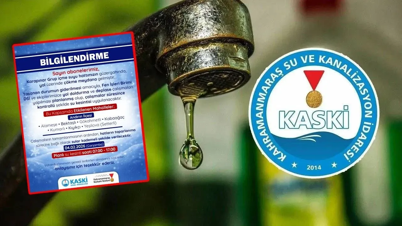 Kahramanmaraş Büyükşehir Belediyesi Su ve Kanalizasyon İdaresi (KASKİ) Genel Müdürlüğü, Andırın ilçesinde ana içme suyu hattında oluşan arıza nedeniyle planlı kesinti yapılacağını duyurdu. Karapınar Grup İçme Suyu güzergahındaki yol üzerinde meydana gelen çökme, ekipleri acil müdahale için harekete geçirdi.