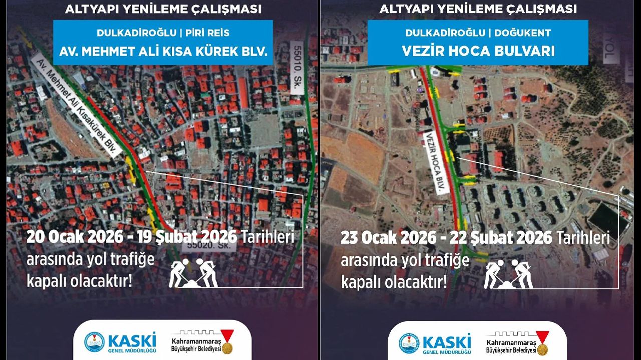 KASKİ, Dulkadiroğlu genelinde etaplar halinde ilerleyen inşa süreci için net tarihleri kamuoyuna duyurdu. Planlama uyarınca kentin en işlek noktalarından biri olan İsmet Paşa ve Trabzon Bulvarı hattı, 21 Ocak ile 4 Şubat tarihleri arasında araç geçişine geçit vermeyecek. Avukat Mehmet Ali Kısakürek Bulvarı ile Piri Reis bölgesindeki kısıtlama ise 19 Şubat tarihine kadar devam edecek. Yetkililer, teknik personelin sahada güvenli bir ortamda çalışabilmesi için bu fiziksel bariyerlerin zorunlu olduğunu vurguluyor.