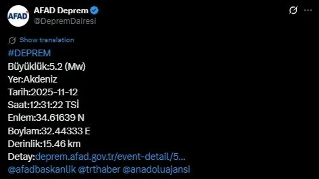 Akdeniz’de sabah saatlerinde iki deprem kaydedildi. Afet ve Acil Durum Yönetimi Başkanlığı (AFAD) verilerine göre, ilk sarsıntı saat 12.31’de 5,2 büyüklüğünde ve yerin 15,46 kilometre derinliğinde meydana geldi. Deprem, Kuzey Kıbrıs Türk Cumhuriyeti’nin yanı sıra Antalya ve Adana’da da hissedildi.