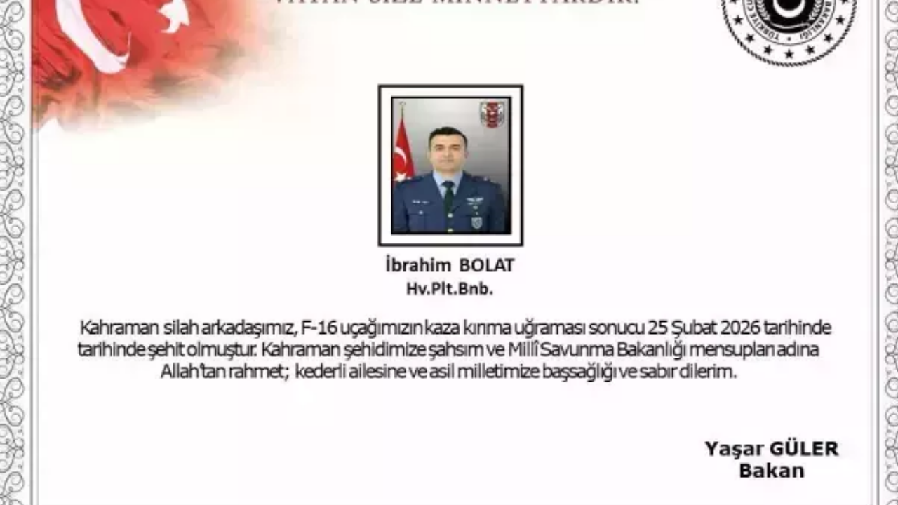 Balıkesir 9’uncu Ana Jet Üs Komutanlığı’ndan eğitim uçuşu için gece yarısı havalanan F-16 savaş uçağından acı haber geldi. Saat 00.56 sularında radar teması kesilen uçağın, İzmir-İstanbul Otoyolu Naipli mevkisinde kaza kırıma uğradığı tespit edildi. Milli Savunma Bakanlığı (MSB), arama kurtarma timlerinin ulaştığı enkaz bölgesinde Hava Pilot Binbaşı İbrahim Bolat’ın şehit olduğunu duyurdu.